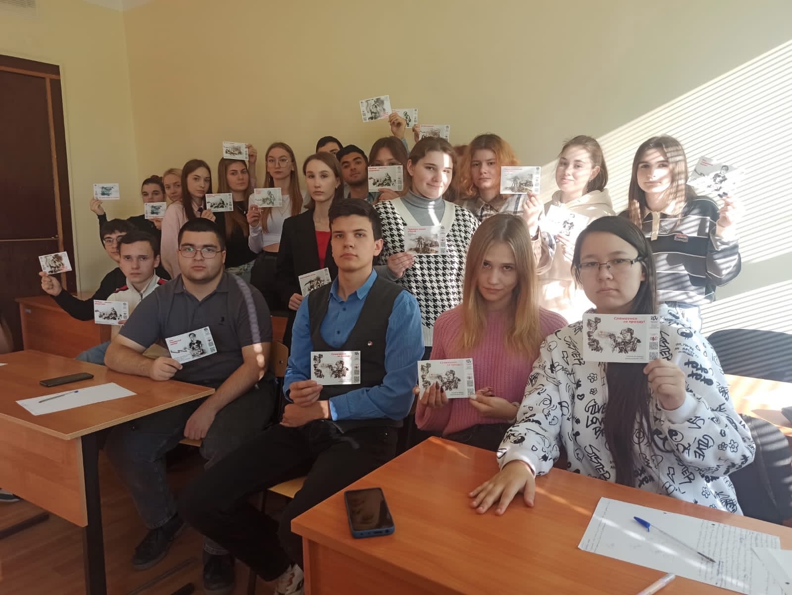 Студенты групп 4368, 4262 и 4161 присоединились к патриотической акции #ЯВИЖУ. На тематических открытках с изображением военнослужащих ребята написали теплые слова для наших бойцов - участников СВО. Все подписанные открытки будут отправлены в зону специальной военной операции.